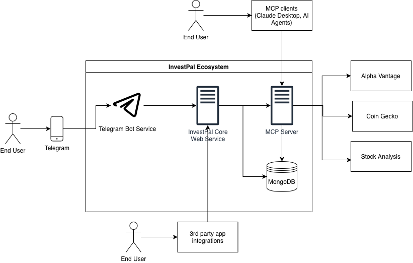 InvestPal is a comprehensive AI-powered investment advisory ecosystem that delivers personalized financial insights and market intelligence through multiple channels. The platform combines cutting-edge artificial intelligence with real-time market data to provide users with professional-grade investment advice accessible through both web services and messaging platforms.